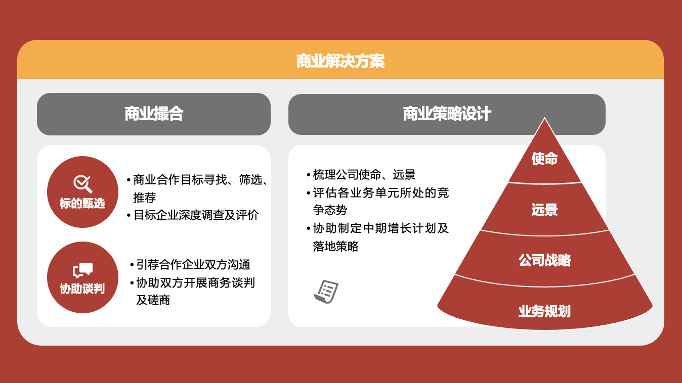基于行业企业研究,以及对企业内部资源诊断,规划企业战略定位、制定可执行的方案和实施路径、匹配和链接商业资源,助力客户实现商业成长。 服务产品包括商业策略设计、商业撮合等